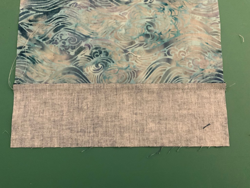 In this example the grey is a short strip laying on a long strip of the brown/blue print fabric.