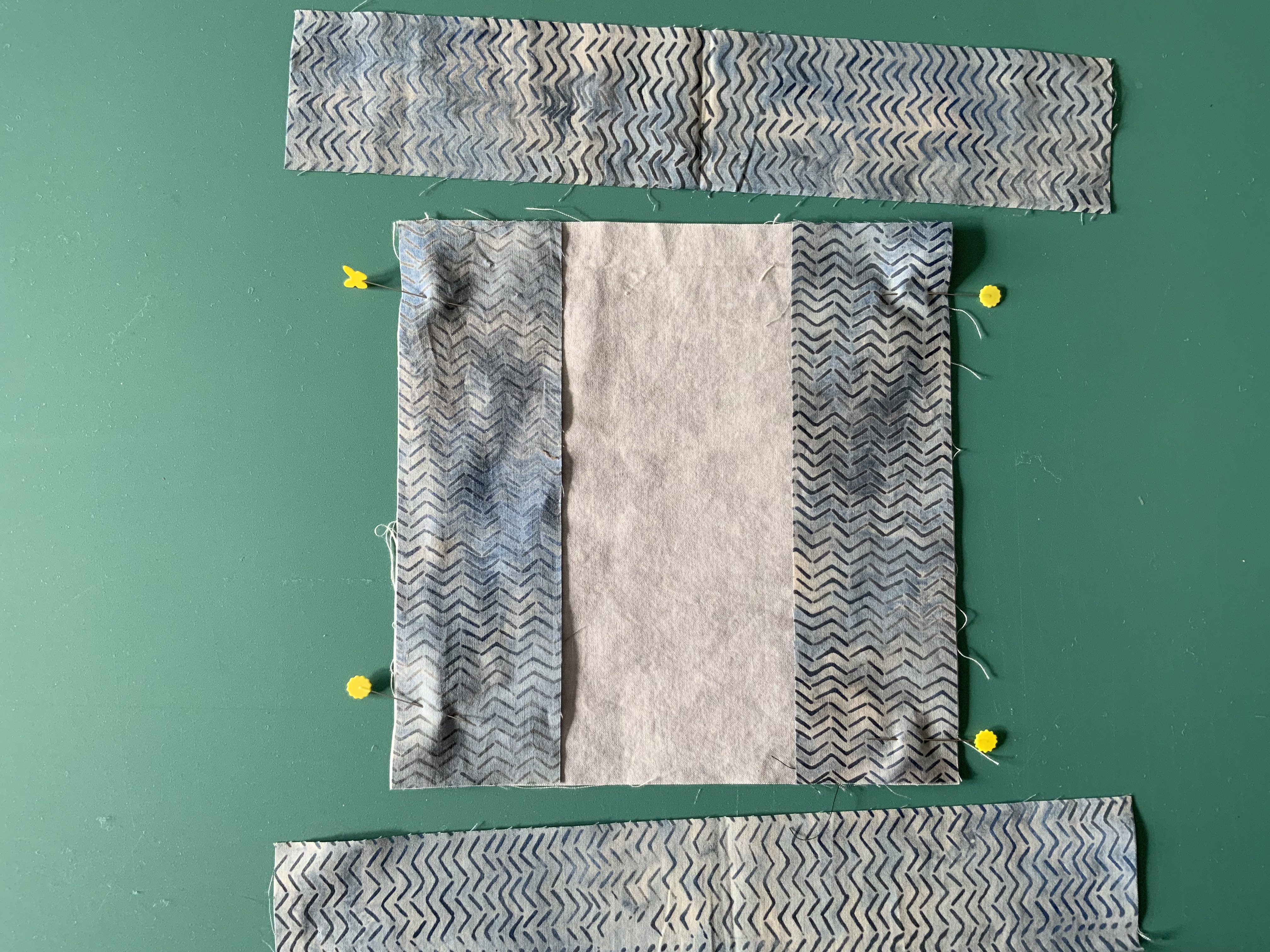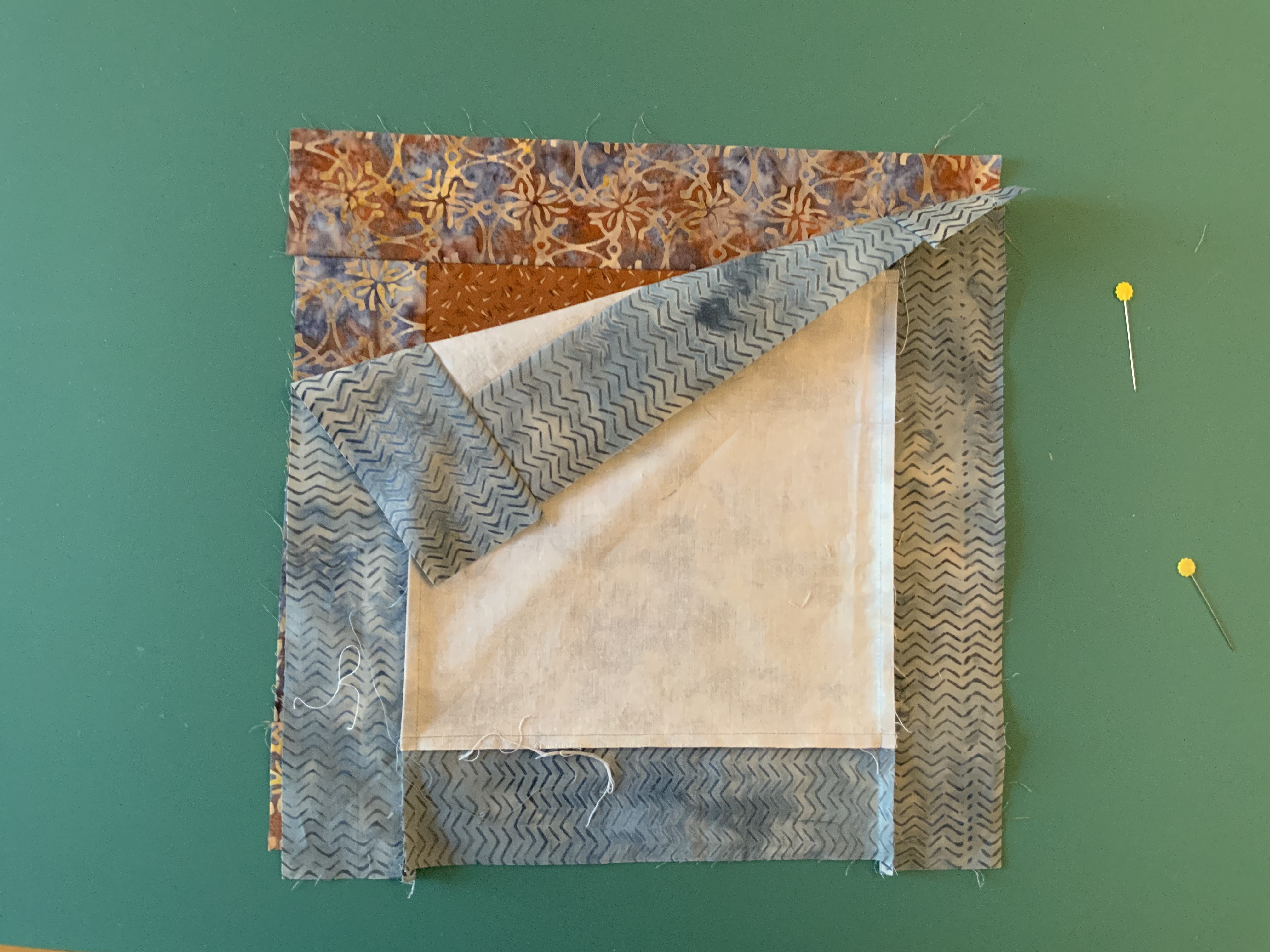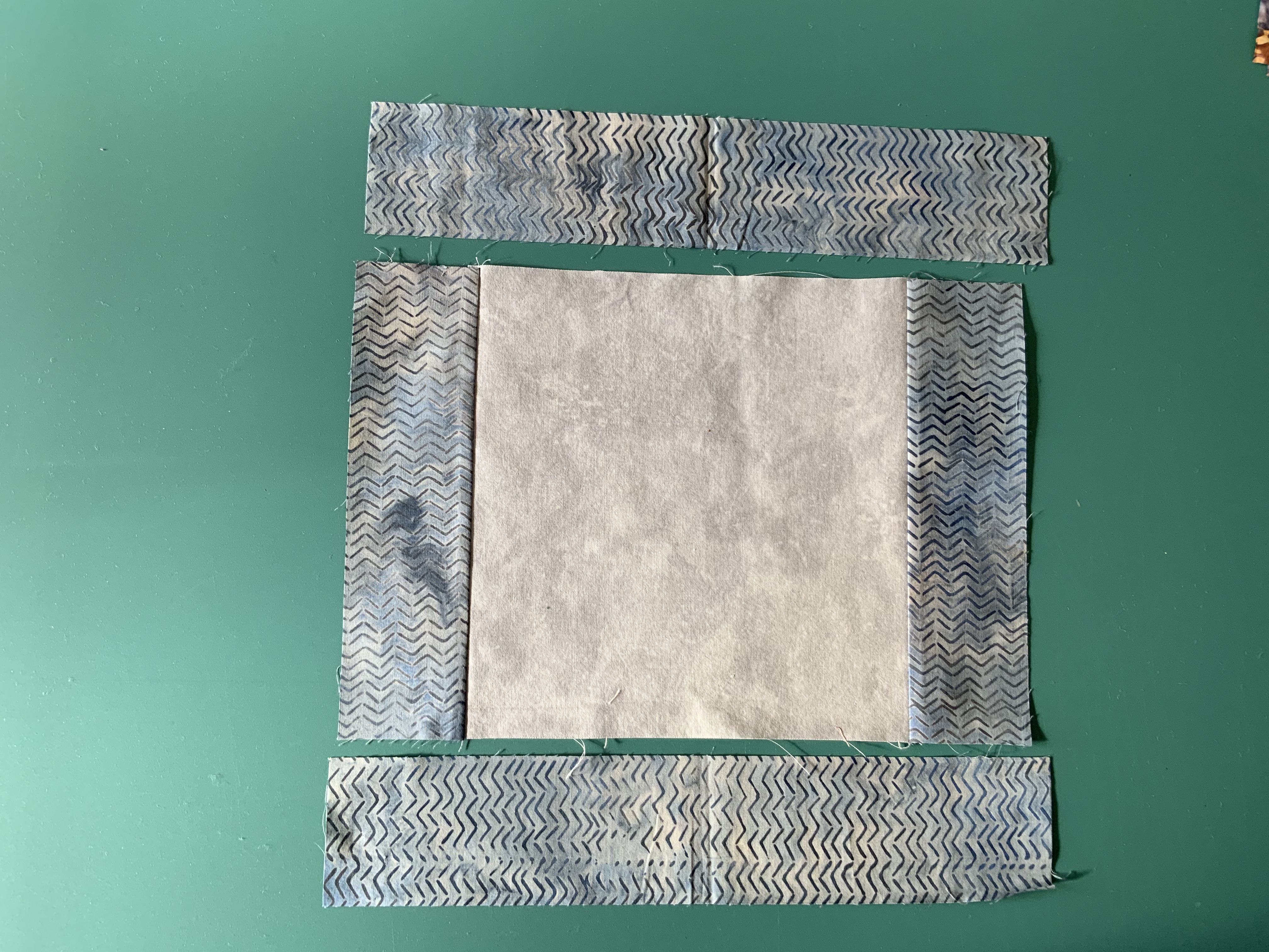 In this example the grey is a short strip laying on a long strip of the brown/blue print fabric.
