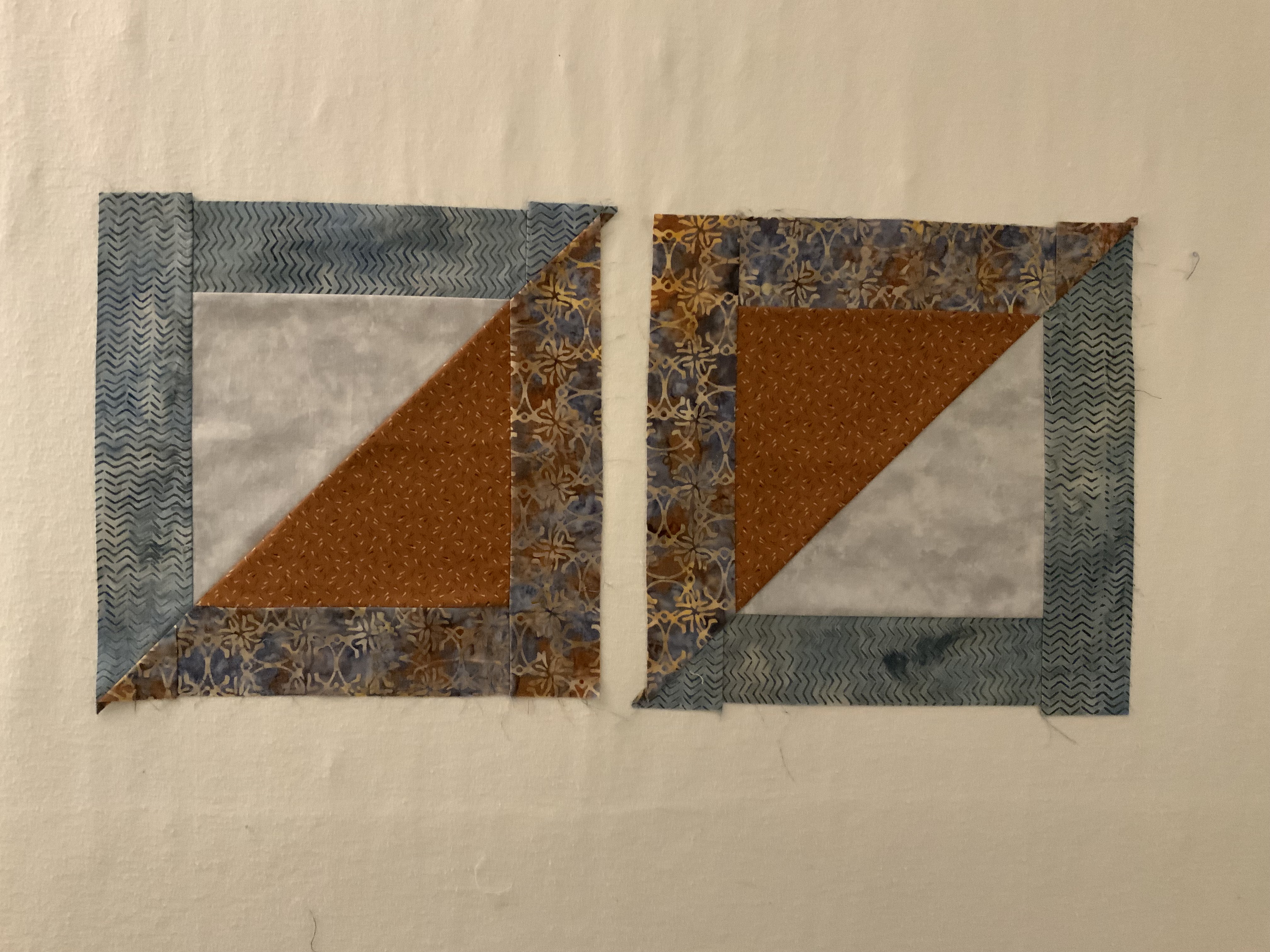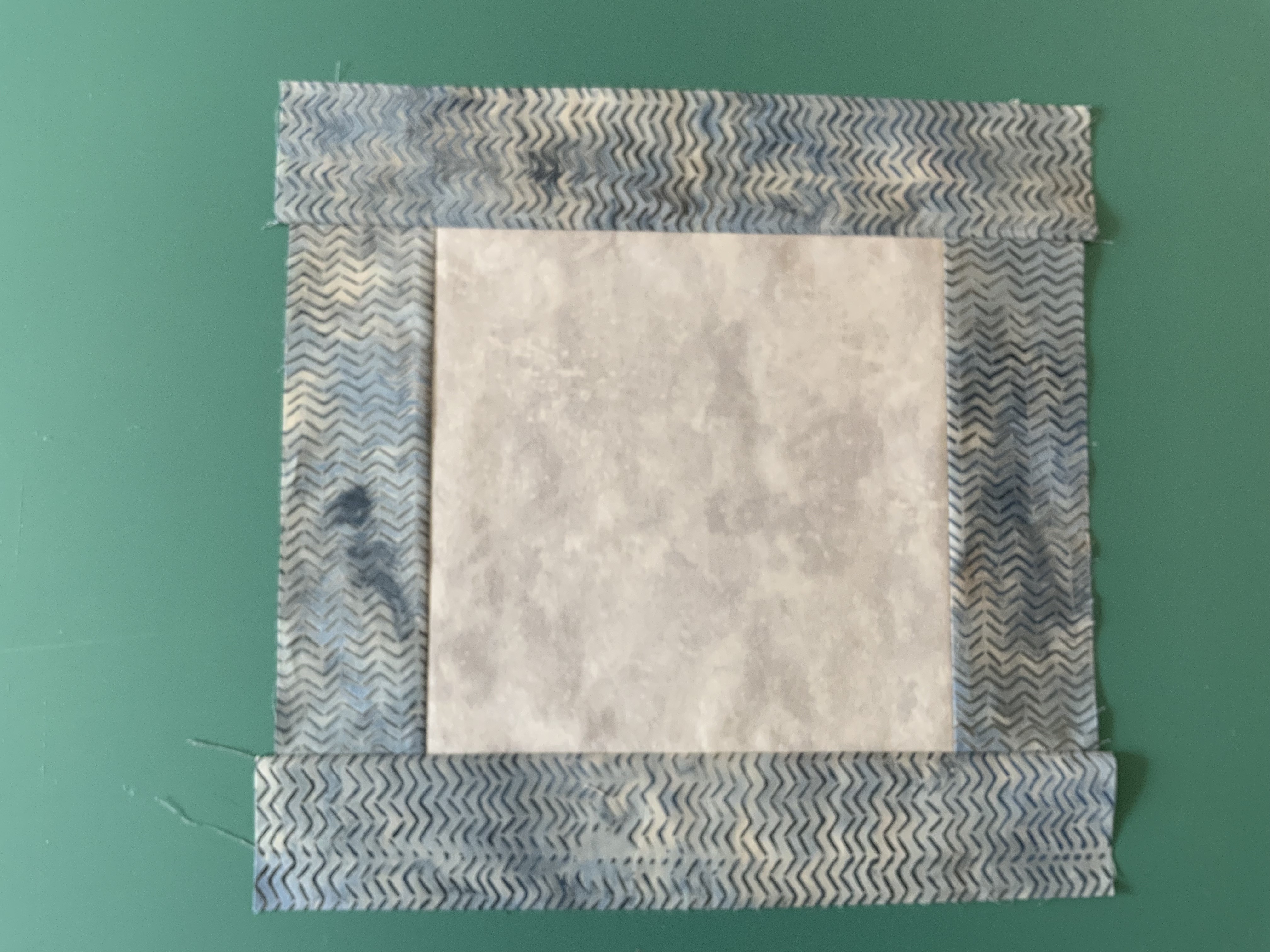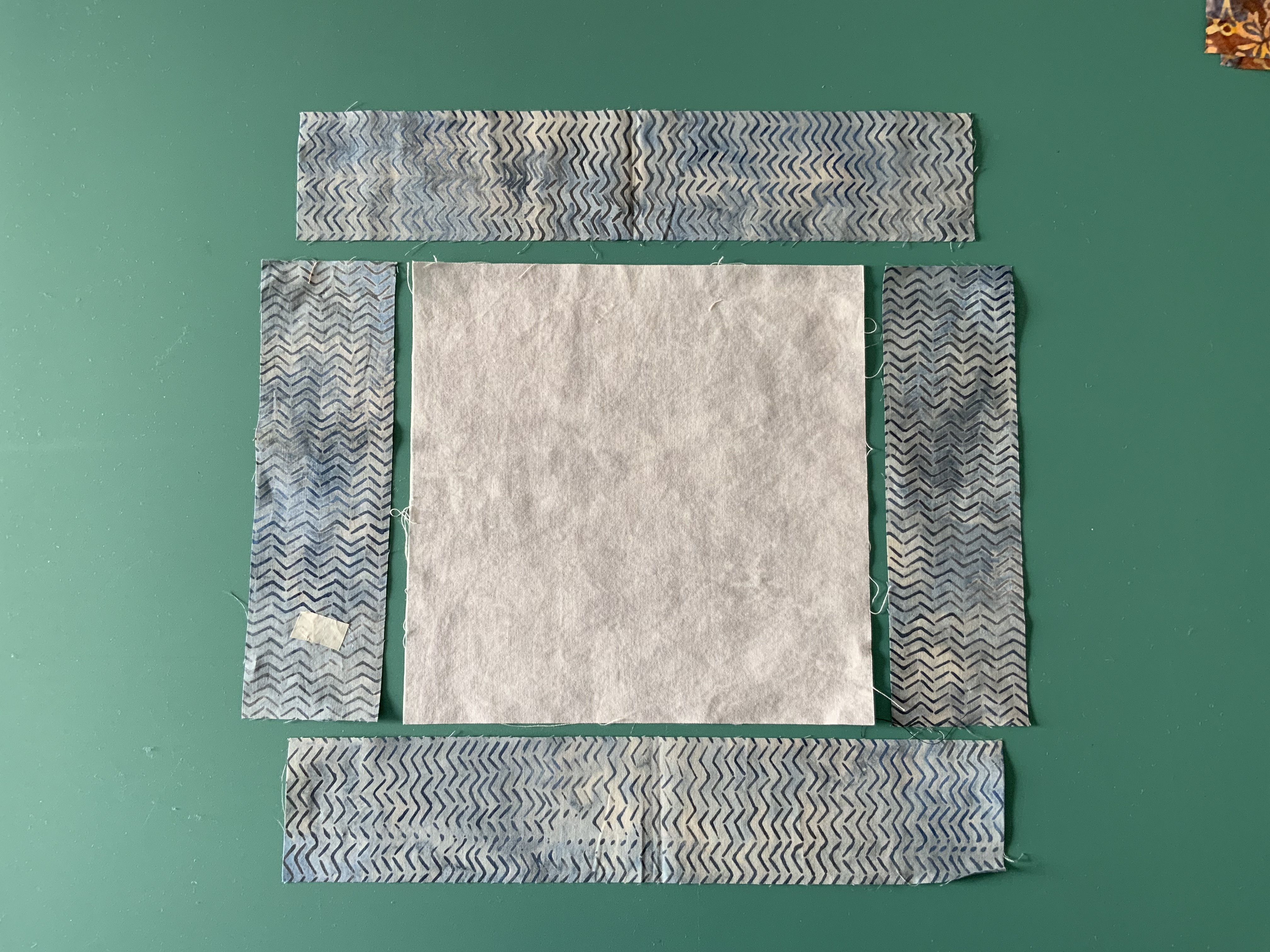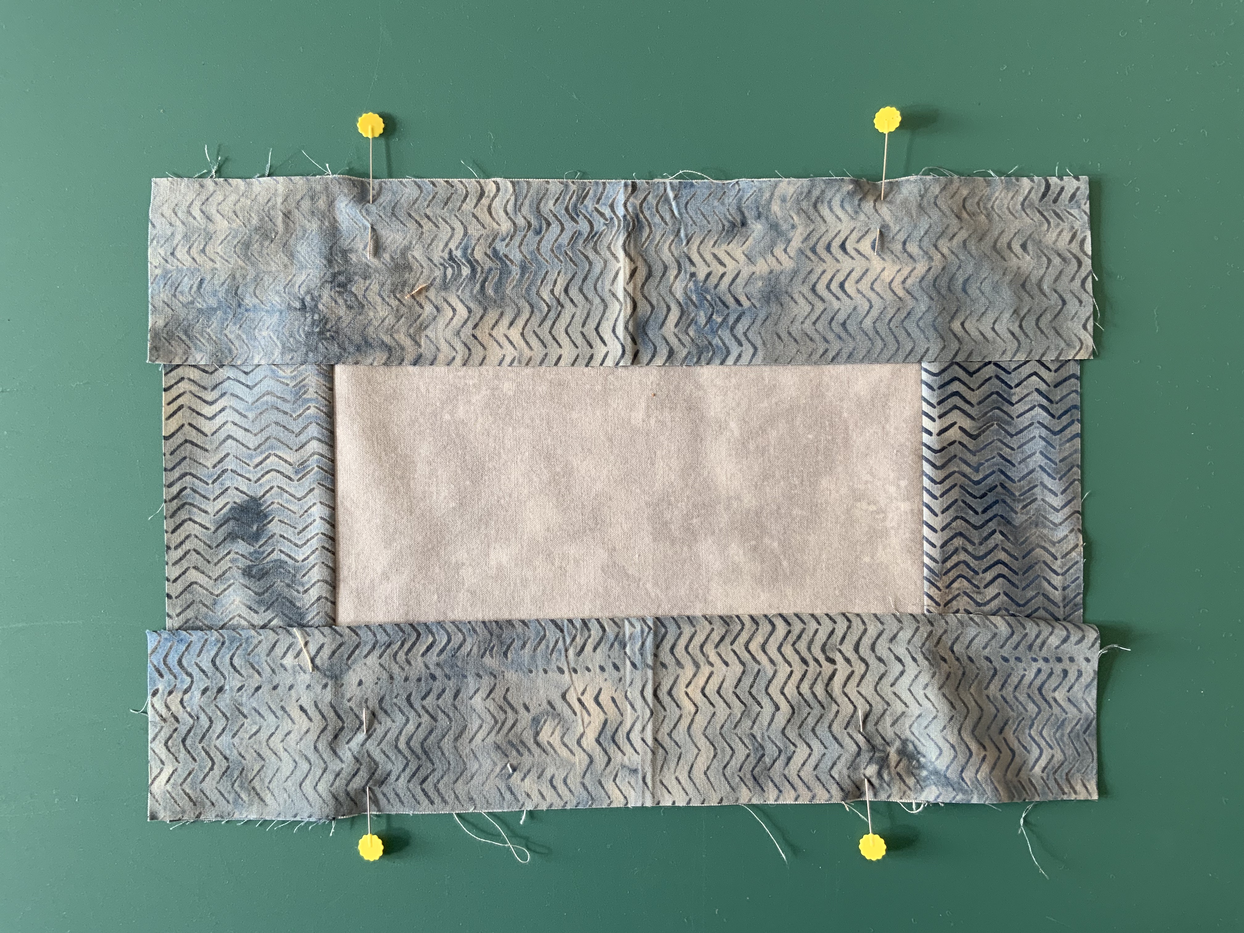 In this example the grey is a short strip laying on a long strip of the brown/blue print fabric.