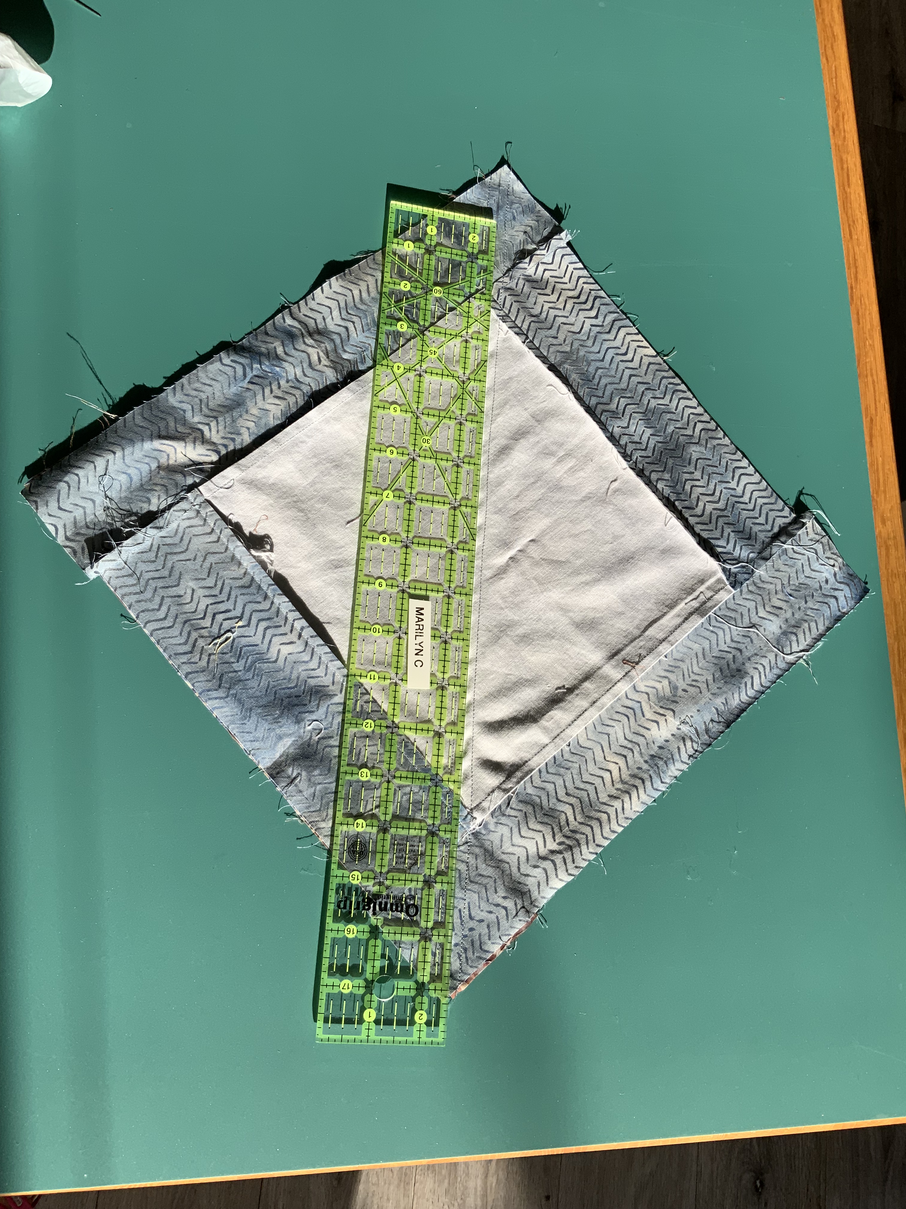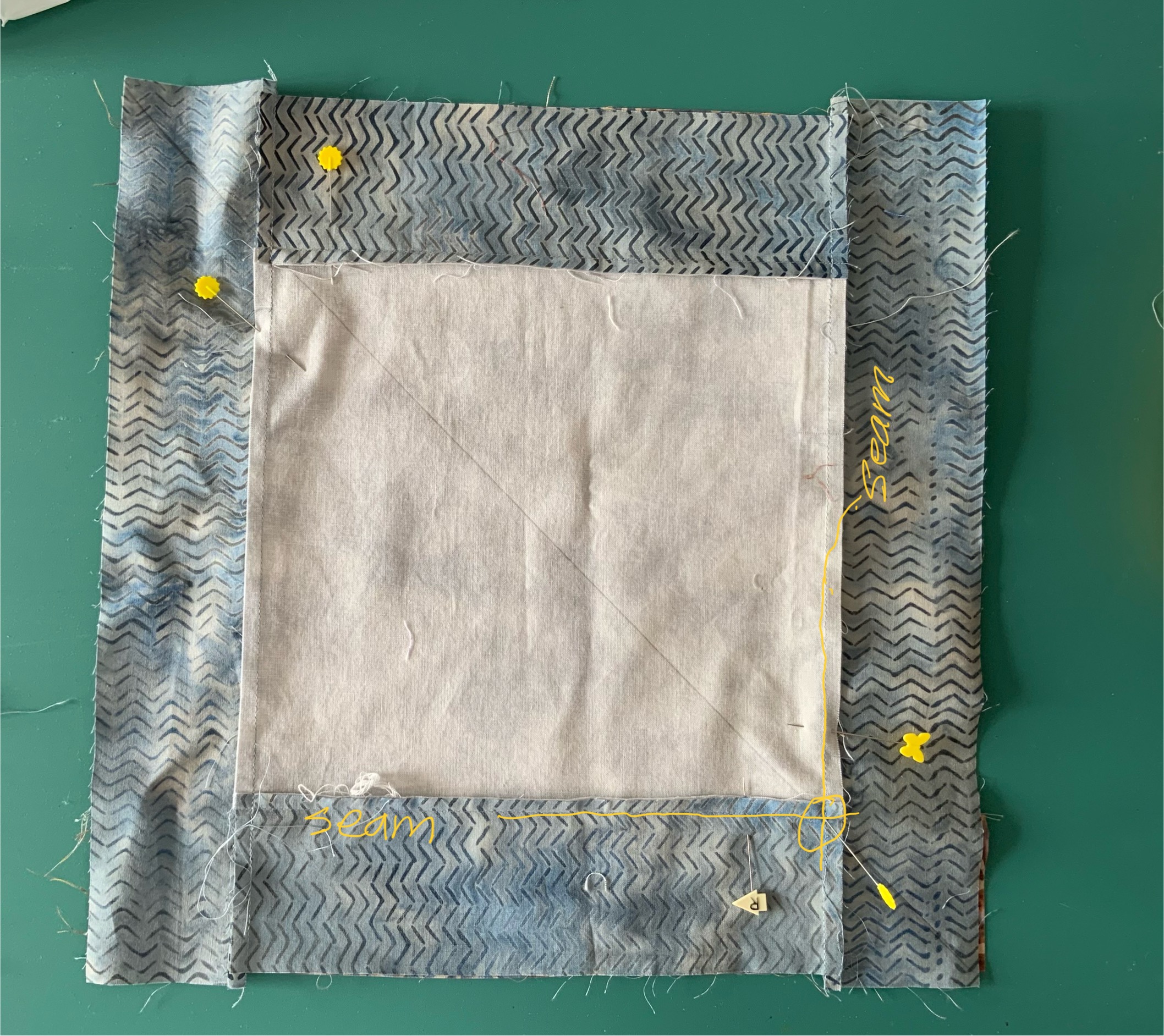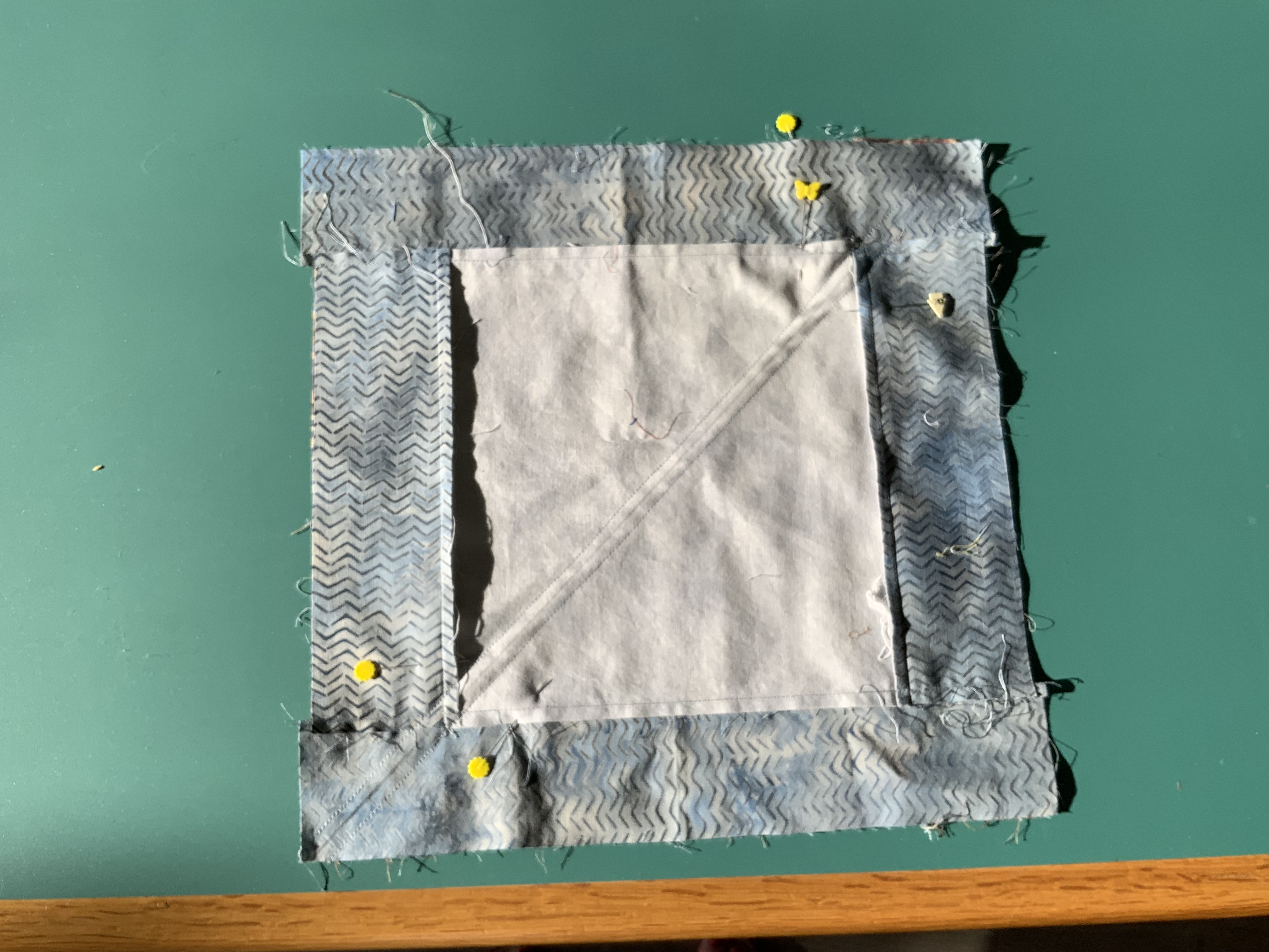 Hint: Other helpful pins would be in the middle of each of the triangles of the centre square. It helps to hold the piece stable when you do the sewing in the next step.